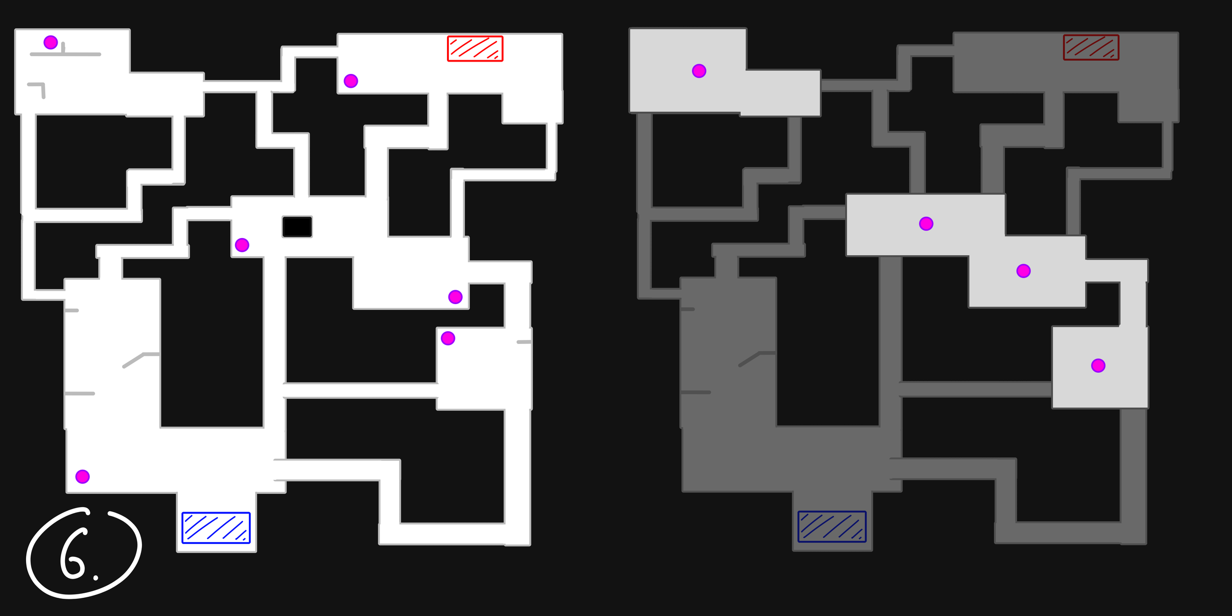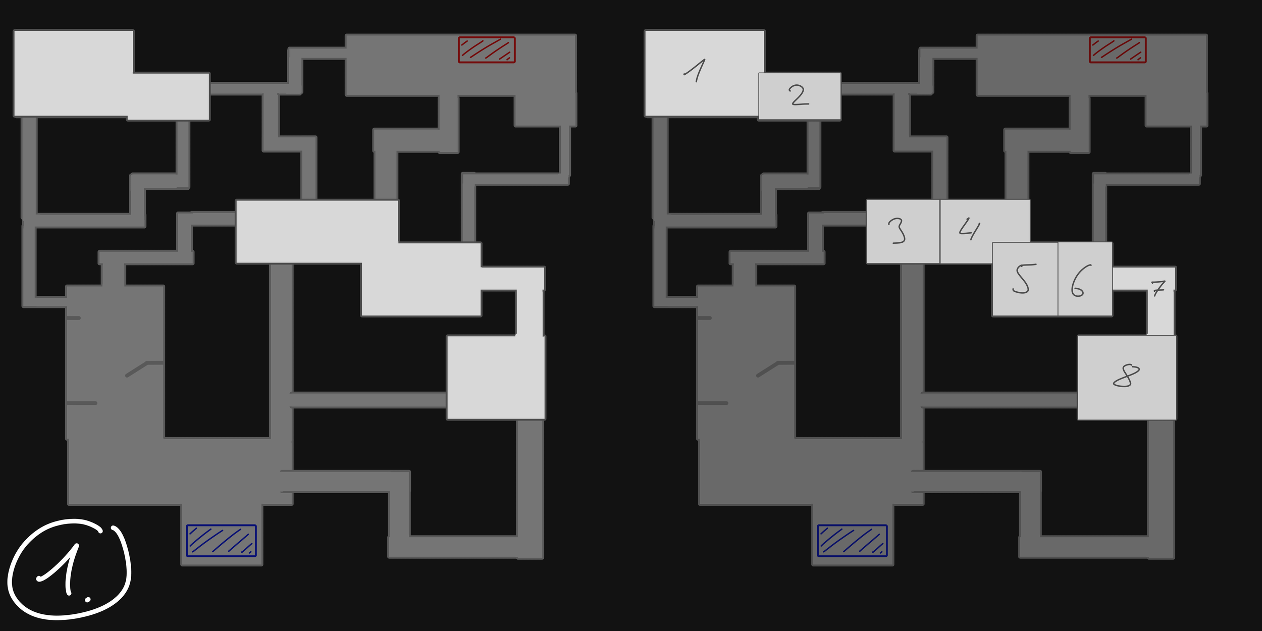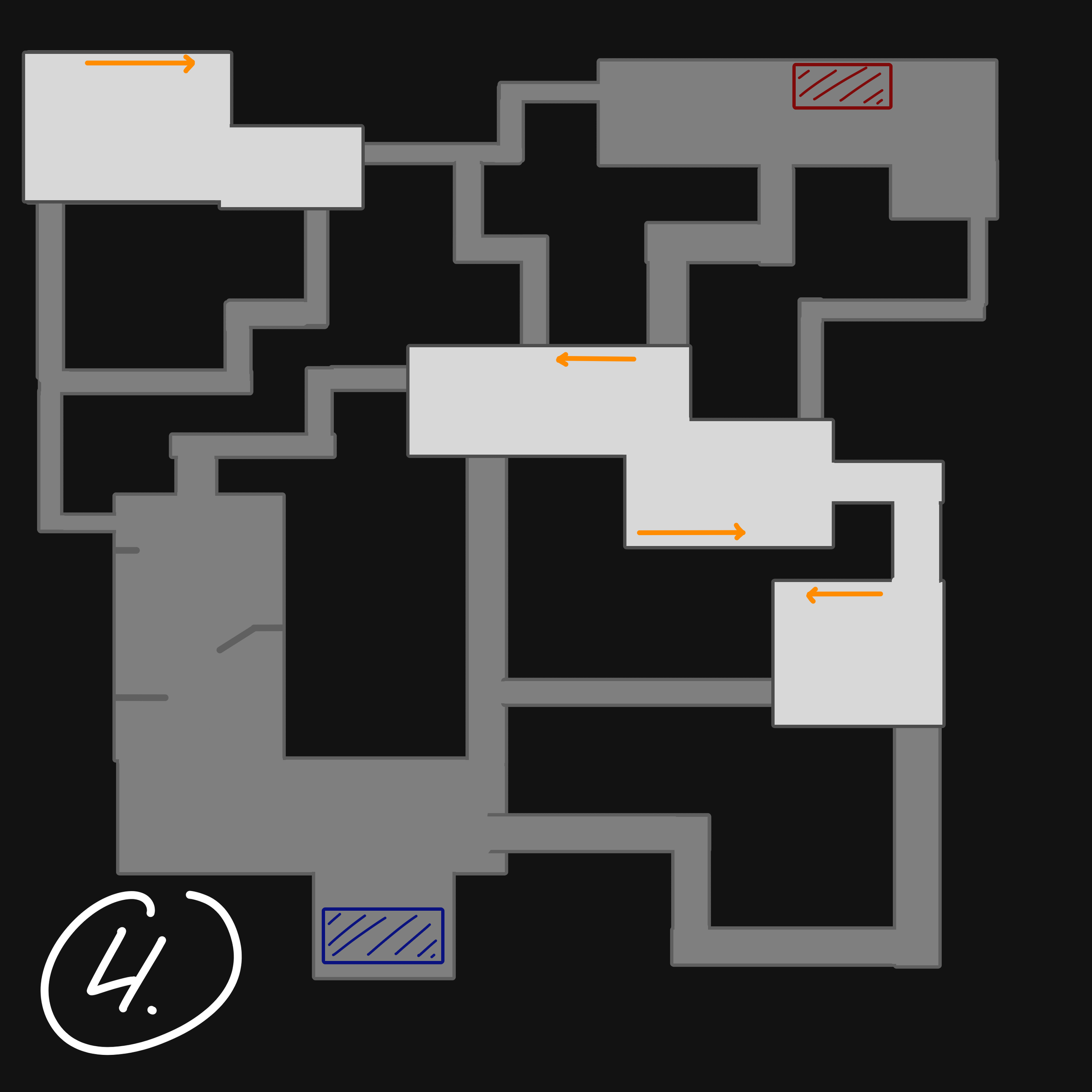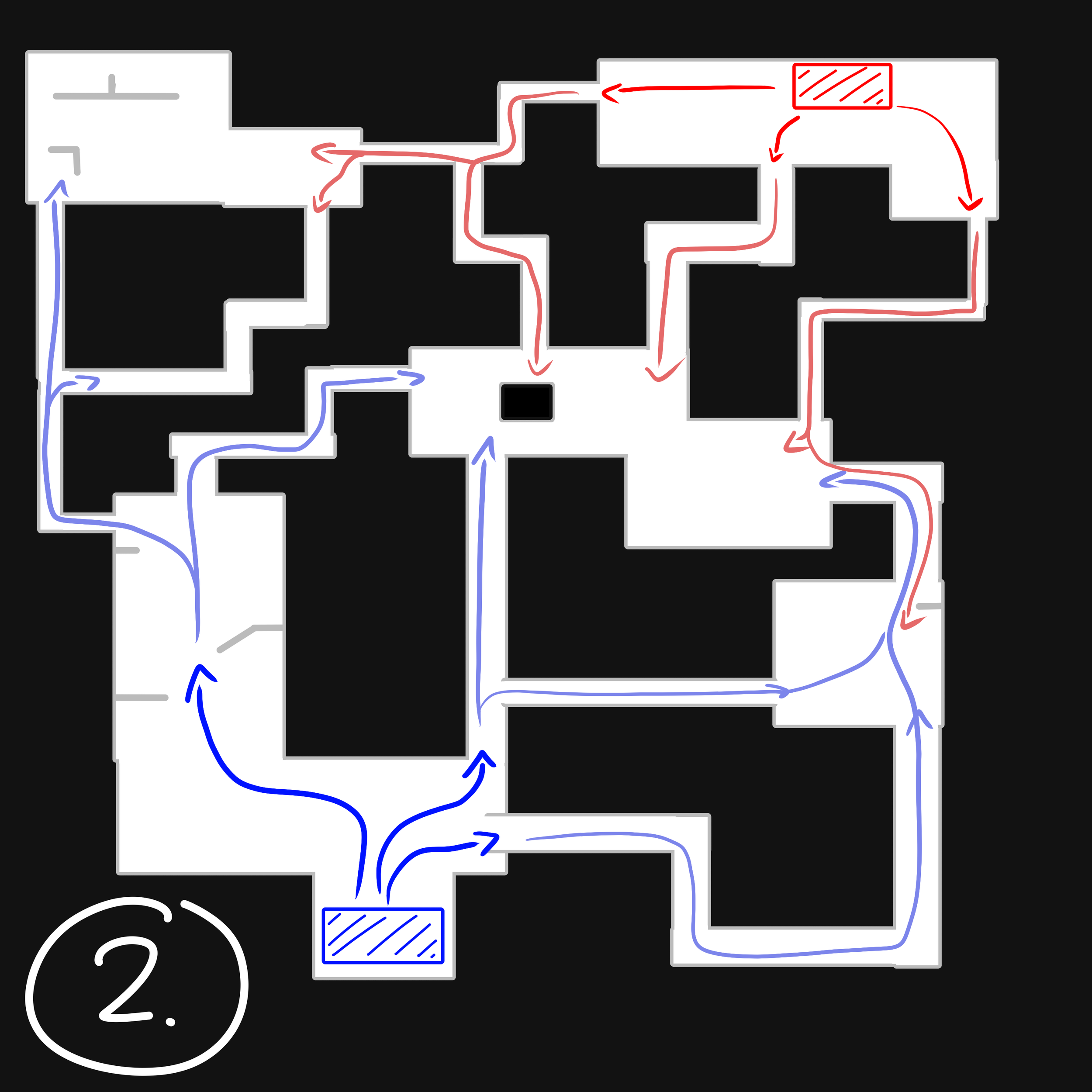 Both teams have as similar options for finding their way to their respective desired destination as possible. This primarily applies to the beginning of a turn, where the teams initially move toward each other in order to meet up. Both spawn points each have three paths out of their starting area, whereby the team members can agree on who goes where and whether the team wants to split up. In addition, both teams have the same number of corridors to the center of the map, 10, which would allow for an even encounter if both teams were to head directly to the central area.